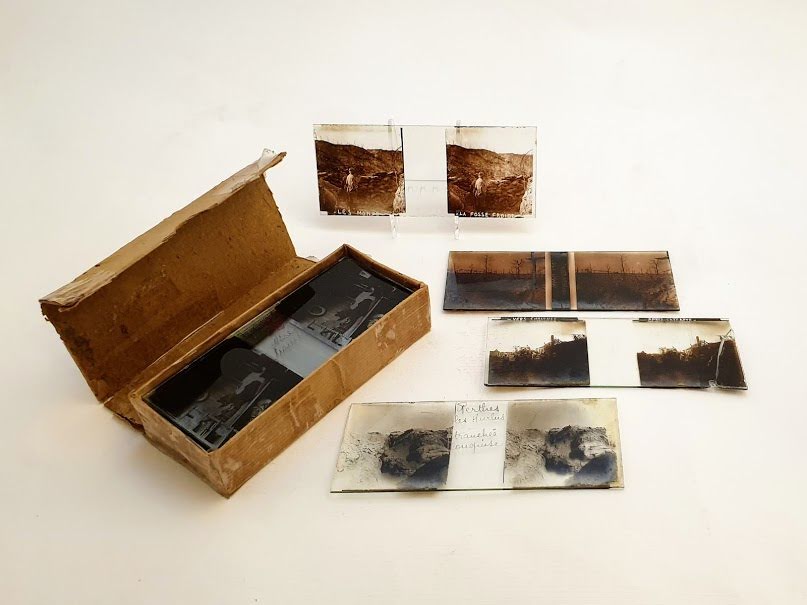 Unikalny komplet 21 szklanych przezroczy stereoskopowych (3D) z czasów I wojny światowej. Rzadki zbiór dokumentujący historię w pionierskiej technice obrazowania.