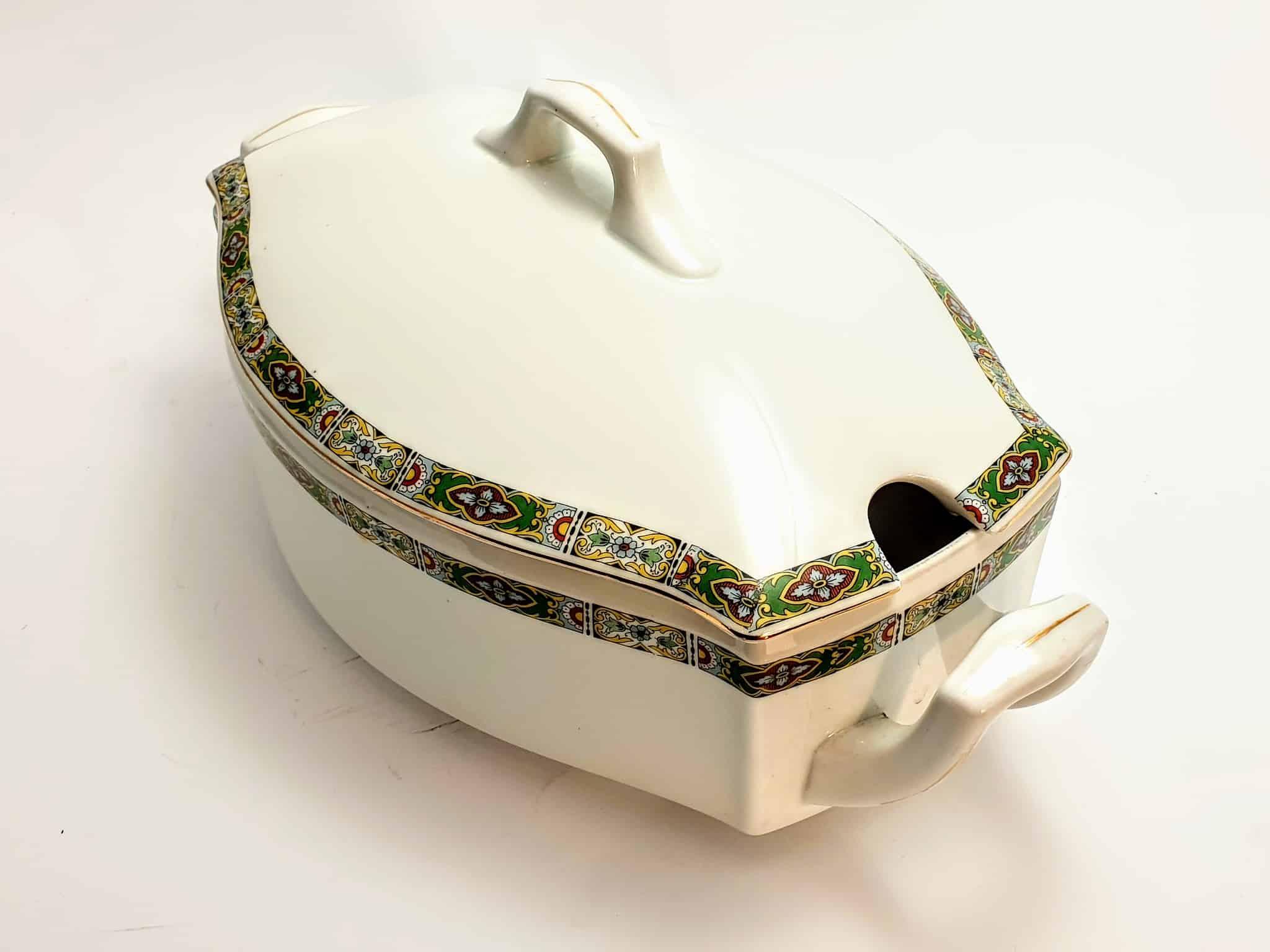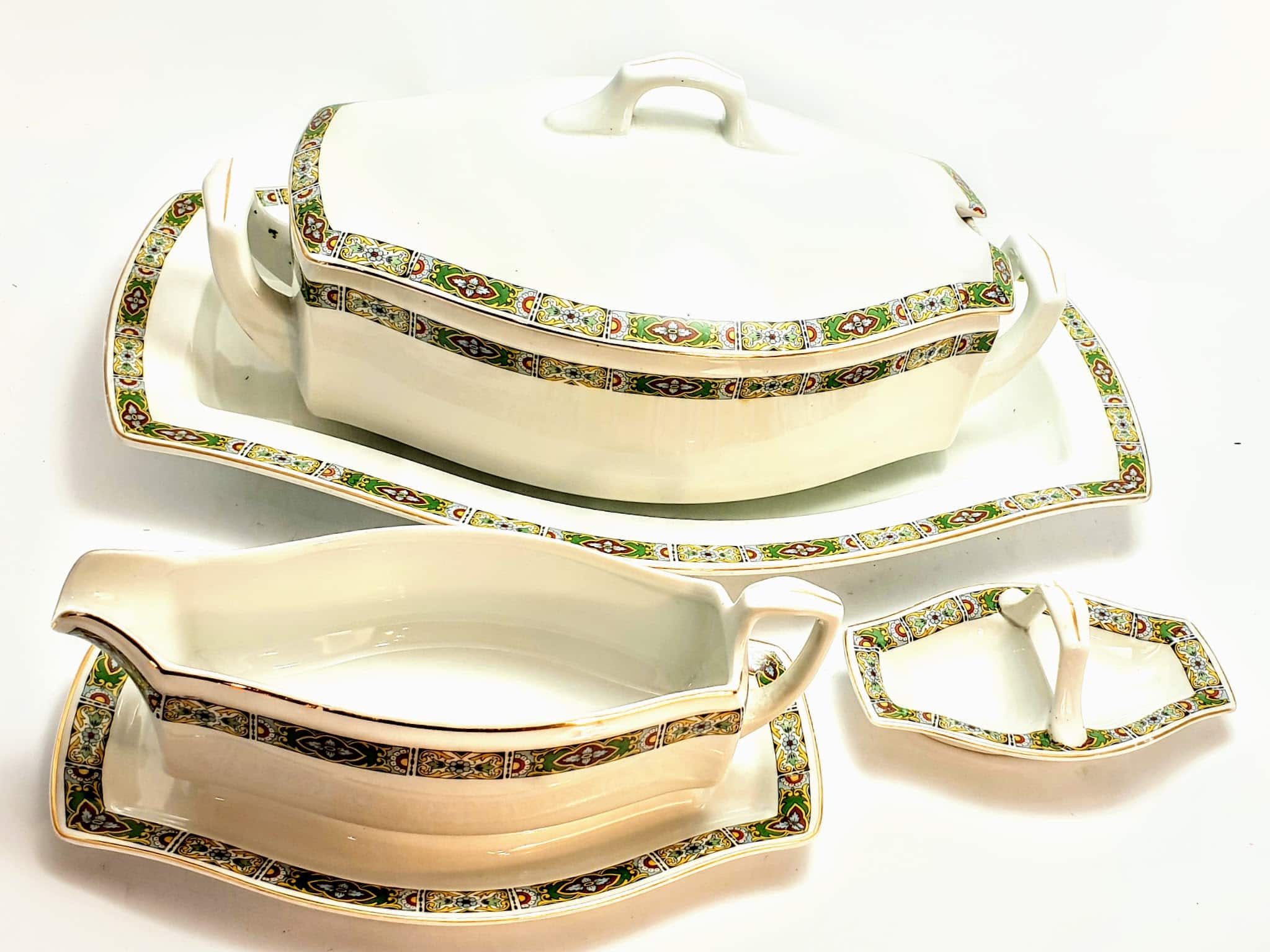 Komplet przedwojennej porcelany Ćmielów: waza, półmisek, sosjerka i solniczka w idealnym stanie. Rzadka okazja kolekcjonerska!