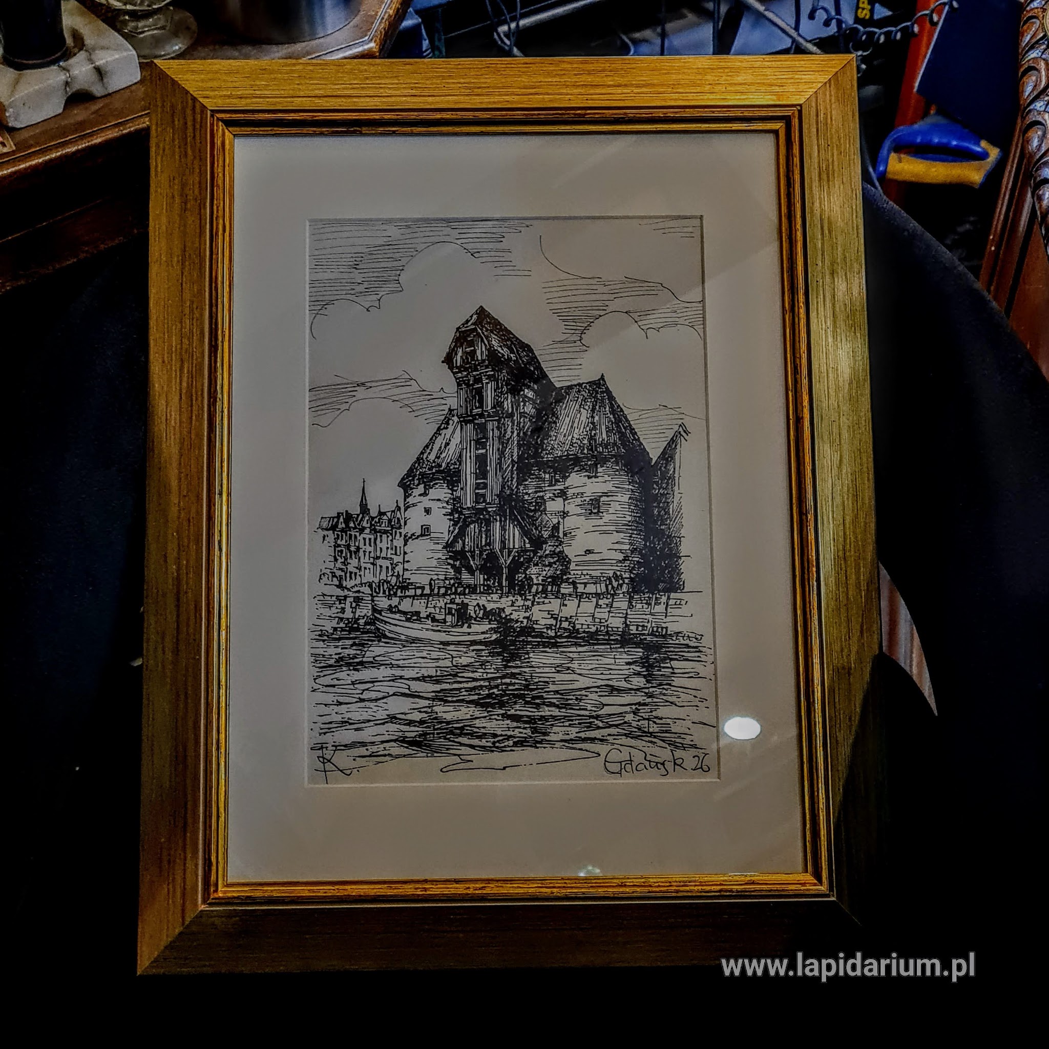 Współczesny obraz Żurawia Gdańskiego w technice mieszanej, sygnowany K. 2026, oprawiony w drewnianą ramę. Unikatowa dekoracja dla miłośników sztuki i Gdańska.